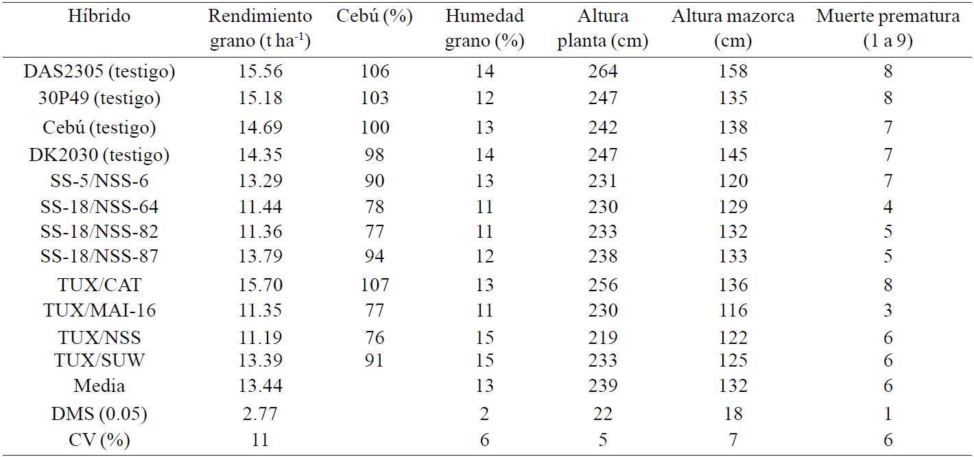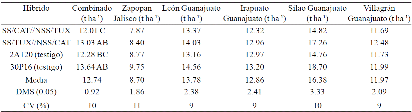 Los resultados de rendimiento de grano de los híbridos dobles y los dos testigos establecidos en las cinco localidades se muestran en el Cuadro 3. El análisis de varianza del combinado para rendimiento de grano mostró diferencias significativas entre híbridos (p≤ 0.01) y entre localidades (p≤ 0.01), y no mostró diferencias significativas para la interacción Híbridos por Localidades (p= 0.36). Los resultados indican que el potencial productivo de los híbridos es significativamente diferente, y según la comparación de medias (DMS /= 0.05) los dos híbridos dobles tienen diferente potencial productivo, siendo SS/TUX//NSS/CAT el mejor; el cual, comparando con los testigos empleados (2A120 y 30P16) no observó diferencias significativas. Estos resultados demuestran que en la formación de híbridos, las combinaciones de germoplasma tropical con templado pueden generar híbridos con alto potencial en rendimiento de grano. Al respecto, Oyervides et al. (1985), en la evaluación de cruzas entre poblaciones desarrolladas en México y poblaciones de Estados Unidos, encontraron buena respuesta heterótica en las pruebas establecidas en México para las combinaciones Stiff Stalk Synthetic y Lancaster cruzadas por ETO y Tuxpeño.