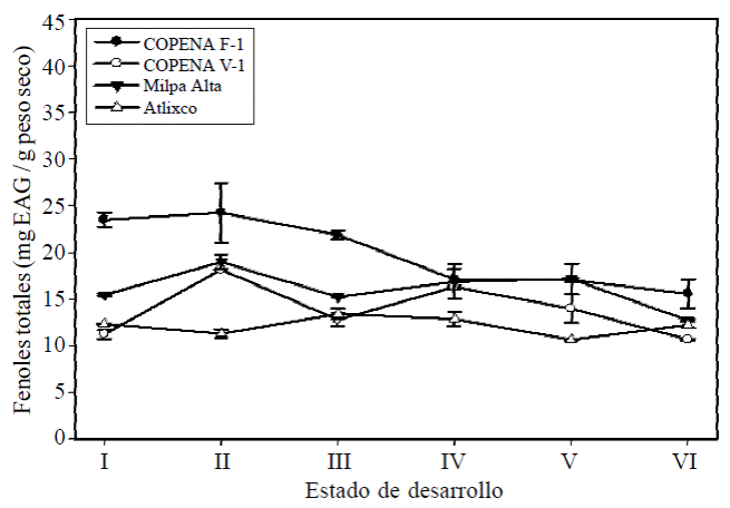 Figure 2 Contents of total phenols during the development of nopal cladodes varieties COPENA F-1, COPENA V-1, Milpa Alta and Atlixco. EAG: gallic acid equivalents. The vertical bars indicate the standard deviation for each stage of development, n= 3.