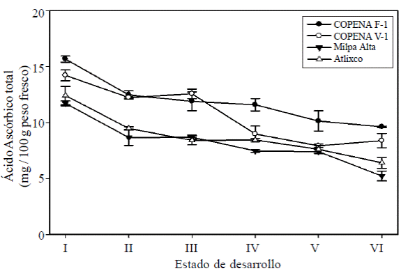 Total ascorbic acid. The content of total AA in the four varieties studied decreased signif icantly (p< 0.05) as advanced development cladode, with values of 13.50 to 7.41 mgAA/100 g fresh weight in cladodes states I and VI, respectively (Figure 3). This indicates a decline of almost 50% of the content. significant differences (p< 0.05) in AA content between varieties studied were found, it was observed that COPENA F-1 had a higher content (11.90 mg AA/100 g fresh weight), followed by COPENA V-1 (10.72 mg AA/100 g fresh weight); while Milpa Alta and Atlixco presented the lowest content (8.79 and 8.19 mg AA/100 g fresh weight, respectively). These results show that the cladodes COPENAF-1 had anAAcontent of 40% higher than those of Milpa Alta and Atlixco.