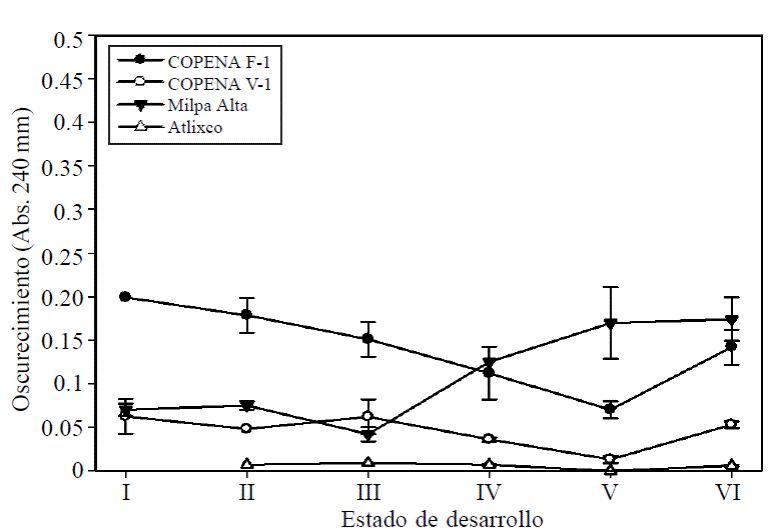 Darkening. Values darkening displayed by cladodes nopal of different varieties and stages of development were low, even after 48 h with absorbance at 420 nm of 0 to 0.2 (Figure 4), finding that no significant changes (p> 0.05) in the degree of darkening at 420 nm during the development of the cladodes of the four varieties tested. However, significant differences (p< 0.05) in the darkening between different varieties were found, showing that COPENA F-1 and Milpa Alta had the highest values, followed by varieties COPENA V-1 and Atlixco that had similar values.