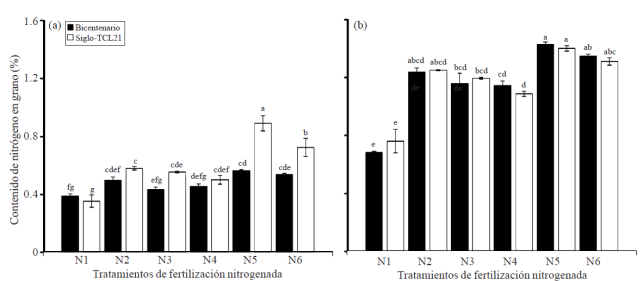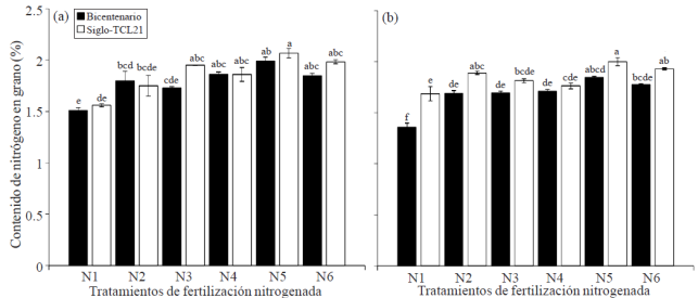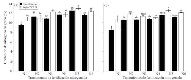 Without nitrogen application, both experiments yielded similar percentages of protein in grains (8.9% to cultivate Bicentenario and 10.6% on average for Siglo-TCL21). Data reported by different authors indicate that later N applications to crop the state of flag leaf are responsible for increases in the N content in the grain (Porsborg et al., 2005; Varga y Svecnjak, 2006). The lack of response in the protein content, probably due to that in this study, the last application of fertilizer was conducted in state herringbone terminal and/ or flag leaf, so no significant changes for this variable were observed in treatments. Percentage values of grain protein, were significantly higher only in some treatments FN in both experiments, especially in E1.