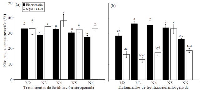 The ERN in the E1 varied between 29 and 34.5%; in contrast to E2, values between 13 and 36% (Figure 6) were obtained. In general, no differences E1 on the fraction of N fertilizer applied in treatments among cultivars were observed, whereas for E2, differences among cultivars were observed.
