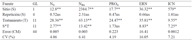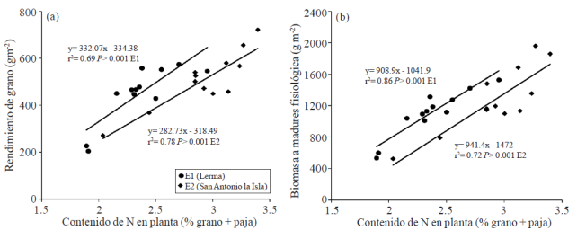 In the Table 2 provides an analysis of variance combined different variables for the two experimental cycles is presented. The RG and biomass at physiological maturity related to the content of total N in the plant in the two experimental sites (Figure 1); These results correspond to those obtained by Emam et al. (2009) and Nikolic (2009), cereals, and of Samonte et al. (2006), in other crops. In both experimental runs a trend of higher (%) of N in grain observed with increasing dose of N; that is, the N applied had an effect, albeit relatively low, on the N content in grain (increments of 0.35 and 0.29% on average of E1 and E2, respectively treatments) compared with the content of indigenous N of treatments where no fertilizer application (N1) was performed.
