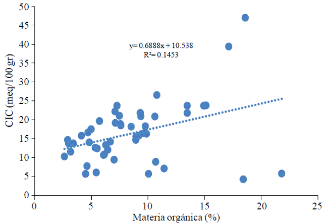 The 14.5% of the behavior of the CIC is explained by the level of organic matter in the soil, in Figure 5, it is observed that in some soils lower CIC values occur when this presents values below 10%; however, there are also plots with low CIC with very high values, which could be influenced by the high level of acidity which limits the rate of humification and mineralization of organic matter.