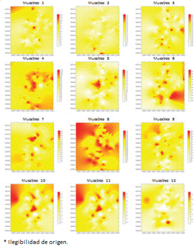 In all models were validated successfully established aggregation maps (Figures 1, 2, 3) of pest incidence allowing viewing. The maps obtained from infested sampling quadrants showed that populations of thrips were located in centers of aggregation surface, indicating that the distribution of the pest, is located at specific points or foci of incidence distributed in the study area. This is consistent with those reported by (Jimenez et al., 2013). For density maps, the red shows the geographical areas in which the largest number of recorded thrips was determined; unlike the white color which is an indication that there are no areas thrips. In plots 1, 2 and 3 (Figures 1, 2, 3) centers targeted aggregation observed.