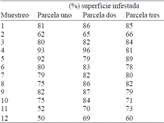 As shown in Table 7, in the case of the plot one the largest area infested was 92% and 93% in the second half of august and early september; in the case of the plot two the maximum percentage of infestation was reached in the second half of august with 96% of the infested area. In the case of the plot 3, the most infested surface can be observed in the first half of September. While the lower surface with presence of thrips was given in the plot one sampling carried out on 18 december, as low temperatures naturally reduced thrips populations.
