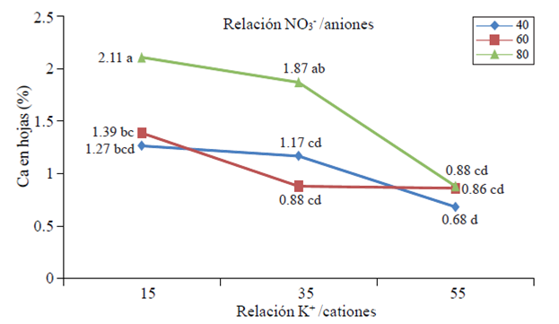The interaction NO3 -/ anion x K+/cation was significant (p≤ 0.01) for the Ca concentration in leaves, while percentage ratio NO3 -/anions factor in the SN affected the concentration of N, P and K, and ratio K/cations was different for N, K and Mg (Table 5). There was no effect on Ca concentrations obtained with the three NO3-/anion ratio relationships for 55/100 K/cations, but there were differences for relations 15 and 35/100 K/cations. In these two ratios K/cations higher values (2.11 and 1.87% Ca) were obtained with 80/100 NO3-/ anions, which were significantly higher concentrations of Ca obtained with 40 and 60/100 NO3 -/anion (Figure 1).