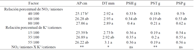 Table 3 Effect of NO3 -/anions and K+/cation ratio in the nutrient solution in height (AP), stem diameter (DT), dry weight of leaves (PSH), dry weight of stems (PST) and weight seedling dry (PSP) tomato.