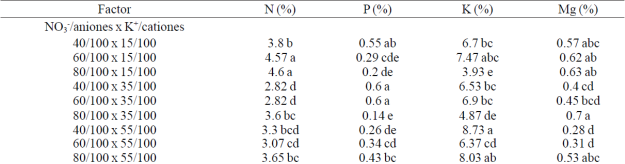 There was a tendency quadratic relationships NO3-/anions and K concentrations, and that increasing 40/100to 60/100 of NO3 -/anions in the SN concentrations K in leaves increased (p≤ 0.05); however, 80/100 NO3/anions, the K concentration decreased, concerning at 40/100 NO3-/anions (Table 5), possibly due to the dilution effect discussed above. The K concentrations increased linearly sheet (a higher concentration of K could increase (%) of K in the leaves), with K+/cations relations in the SN; the highest concentration (5.83%) was obtained 55/100 K+/cations and lower (3.67%) with 15/100 K+/cations. A negative trend was introduced between the K+/ cations and Mg concentrations in leaves, because the Mg concentrations decreased with increases in the K/cations, indicating antagonism between K and Mg (Fageria, 2001), as the lower value (0.49% Mg) was obtained 55/100 K+/ cations and greater (0.88% Mg) was obtained with 15/100 K+/cations (Table 5). The K+/cation ratio affected (p≤ 0.05) the N concentration in leaves where the highest concentration (4.87%) was obtained with the ratio 15/100 K+/cations and the lowest (4.52%) with 35/100 K+/cations (Table 5).