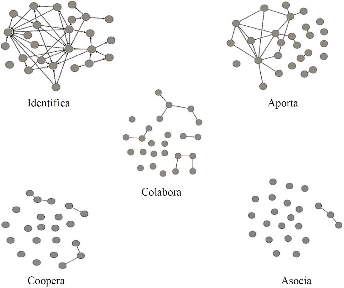 Rovere (1999 and 2004) states that networks are networks of people, where they connect or link people which defines networks as the language of links, where in the process of building networks there are different levels or depth link whose knowledge serves to organize and monitor the degree of consistency of a network based on present values flowing in relations given in five levels, each of which serves to support the following, these levels are: 1) recognition : it states that the other exists, as interlocutor, even as an adversary; present value: acceptance; 2) Knowledge: what the other does, what the other is; present value: interest; 3) Collaboration: assist sporadically present value: reciprocity; 4) cooperation: activities and knowledge sharing; present value: solidarity; and 5) association: support joint projects or initiatives which involves sharing resources; present value: trust. This process of building links poses aimed generating deep relationships of trust; the which are more dynamic to lead to collective action in positively influence the development and economic growth (Teilmann, 2012; Koutsou et al., 2014) since the essence of networks constitutes associativity (Rovere and Tamargo, 2005).