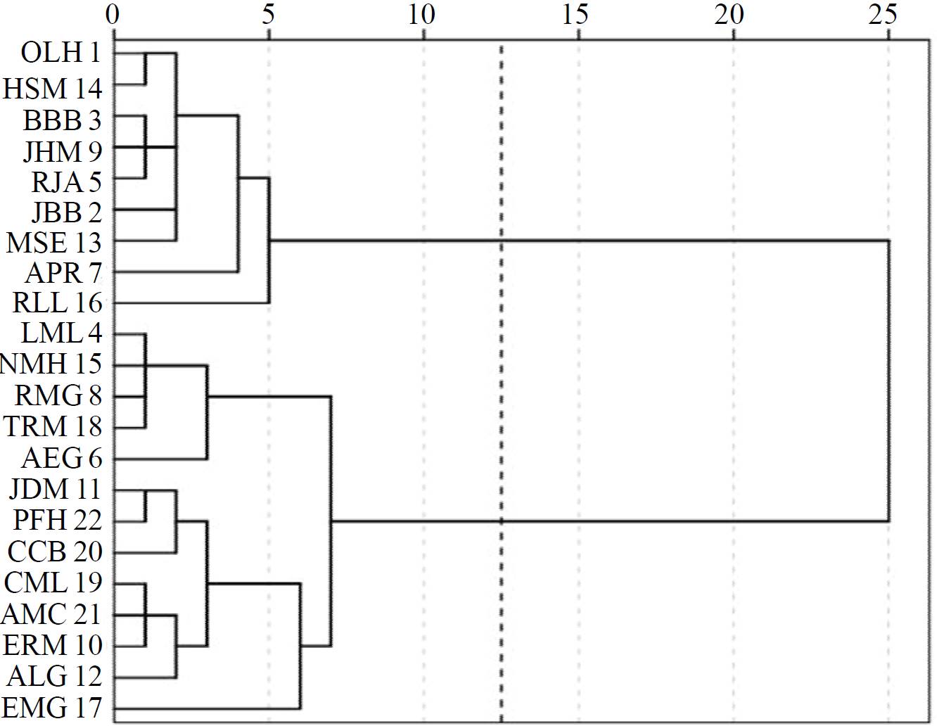 For the identification of symmetry level present between producers rambutan studied, cluster analysis (clusters) hierarchical using euclidean distance and agglomeration method of Ward according to the methodology developed by Perez (2004) was performed, as shown in Figure 3.