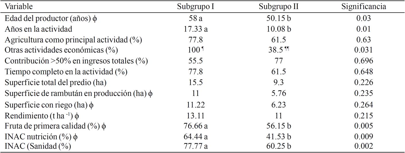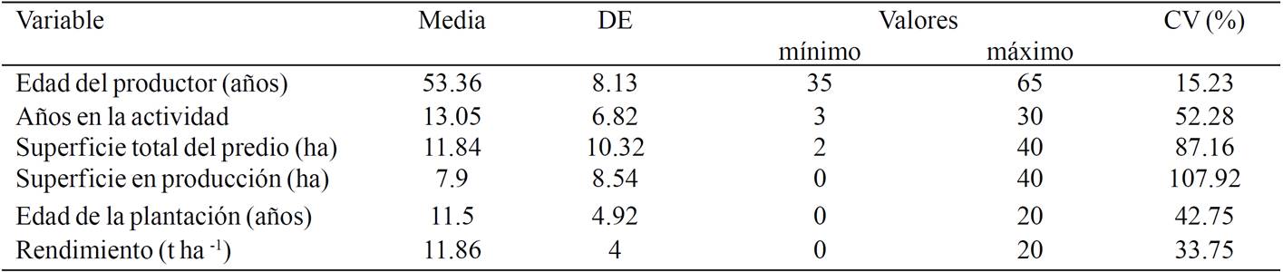 The Table 1 shows the profile of the surveyed producers and their production units. The information indicates that the attributes that had a higher coefficient of variation correspond to the land surfaces, surface production rambutan and years devoted to productive activity. The years engaged in productive activity, indicating that producers have spent on average about 25% of its total age-related work this crop considering the average age of them. With respect to years of schooling, this group of producers has a high educational level, 76% have studies than high school level and exercise activities as teachers, merchants, professionals, bureaucrats, among others related to the service sector, allowing a diverse set producers in terms of economic activities.