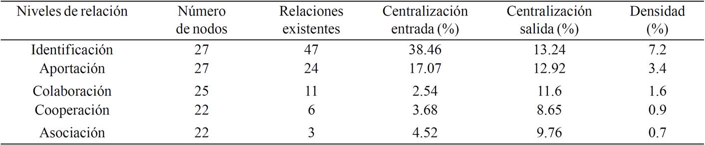 In levels identifies and provides cataloged by Mamani (2012) as superficial as many relationships is located, allowing indicate that activities that producers usually performed with peers were related to interest in joint action, such as test new products and share ideas and information. In a smaller proportion has been given the exchange of relevant information that a positive impact on their productive activity, such as recommendations of fertilization, performing certain cultural practices, and reference nurserymen with good genetic materials for planting new areas. Disarticulation existing high levels of deep collaboration, cooperation and partnership sets up a scenario where a f low limited prevails and scarce collective values of reciprocity, solidarity and confidence as shown by the density indicators (Table 2).