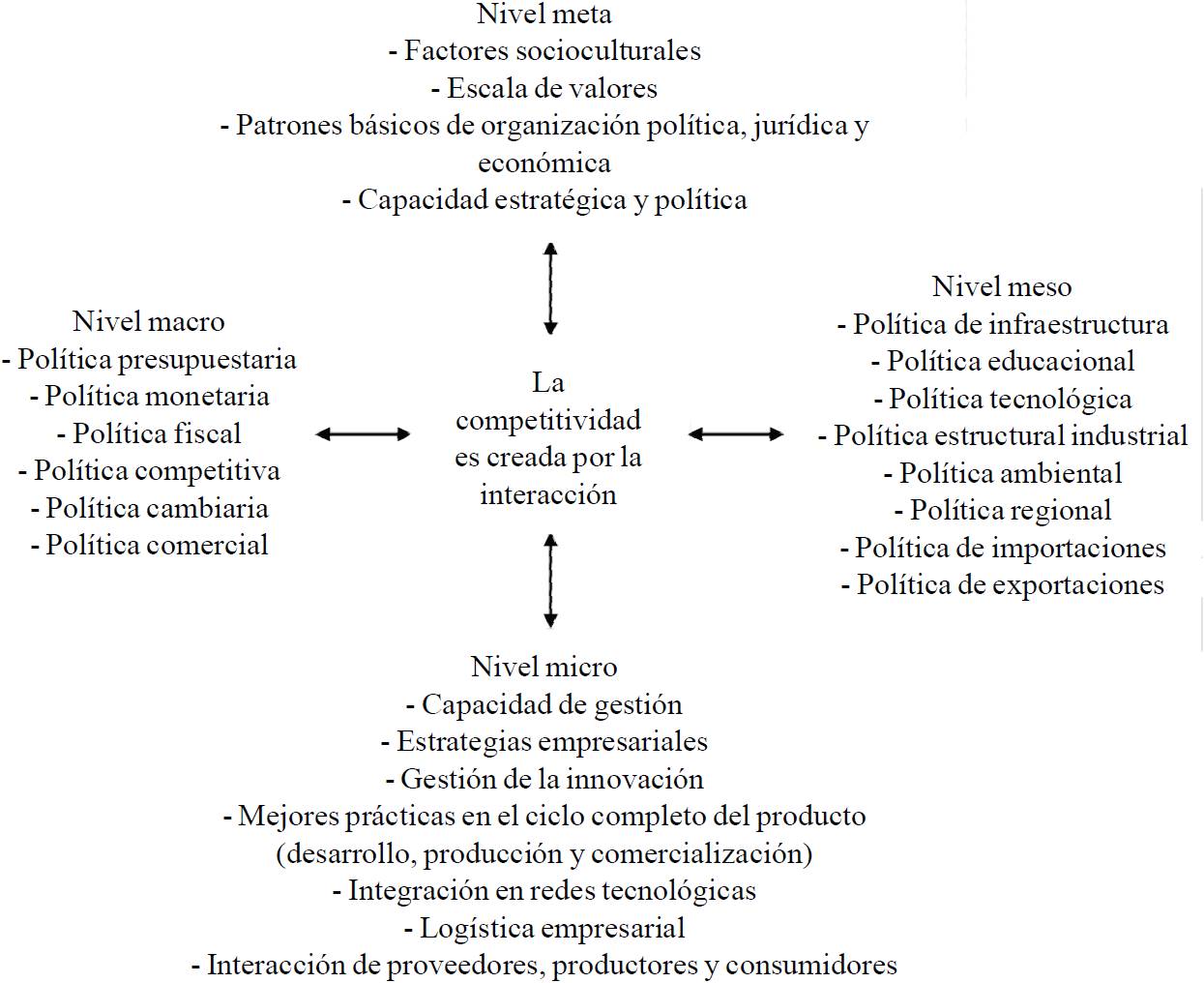 This doctrine sees competitiveness as a relationship between efficiency, productivity, competition, and improving the living standards of the people, which arises from the interaction between the state, enterprises, intermediary institutions and organizational capacity of society. As shown in Figure 2, to understand the dynamics of competitiveness from the systemic approach it is necessary to analyze the micro level, the meso level, the macro level and the target level (Esser et al., 1996).