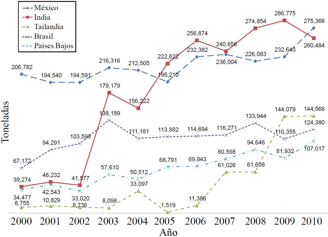 The mango imports by the United States of America has maintained an upward trend, with Mexico as the country that has covered more than 80% until 1998 (Figure 3). However, from 1999 onwards the Mexican mango has lost market share and has failed to maintain this hegemony due to quality issues related to tender mango, often sent to early season, and which does not mature properly shelf. Also, rot it caused by the disease called anthracnose has slowed exports. With regard to varieties exported, but have nine, only two concentrates over 68% of export volume and although the variety Tommy Atkins retains the lead, with 34.5% of the total, the variety Ataulfo increased by more than 200% export volumes between 2005 and 2012, accounting for 33.7% of exports.