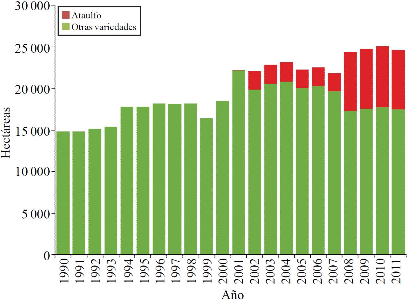 For Guerrero, the mango value network noted for its economic importance, ranking second by value of production to generate revenue of more than 1,150 million pesos in 2011, second only to corn grain. It was the fourth volume of production and fifth in planted more than 24,000 hectares, which grew by 67% between 1990 and 2011. This growth is attributed to the fact that the producers chose to replace palm plantations of coconut by mango given their greater profitability. The variety is ataulfo which has grown from surface 2002 (Figure 4) because it is considered one of the most attractive, both for the domestic market and the international.