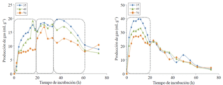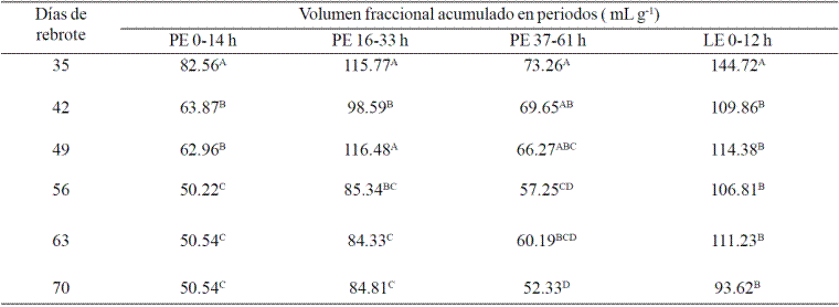 The fractional volume of 0 to 14 h, in C. nlemfuensis was higher (p< 0.05) in DR 35 d followed by 42 and 49 d and finally by 56, 63 and 70 d (Table 2). A similar trend was found for the other two fractions (16 to 33 and 37 to 61 h), where DR plants produced lower gas and therefore less fermented (Table 2). In L. leucocephala only in the DR of 35 days compared with the other DR distinguished analyzed.