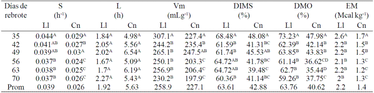 Table 1 Parameters (S, L and Vm) of the kinetics of fermentation gas production, DIMS, DMO and EM of Leucaena leucocephala (LI) and Cynodon nlemfuensis (Cn) of six periods of regrowth.