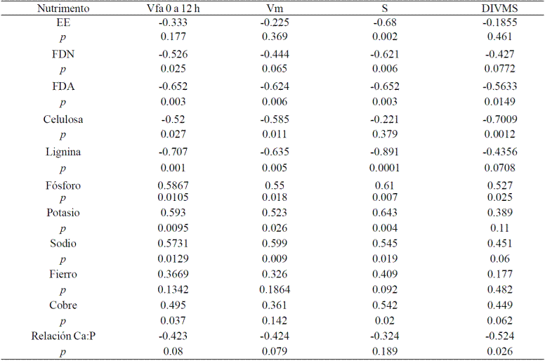 The PC is the only nutritional component is positively correlated (R= 0.566 to 0.675, p< 0.02) with variables fermentation and DIVMS, but only in Cynodon nlemfuensis. The FDA, FDN, cellulose and lignin are negatively correlated (p< 0.03) with these variables. It is noteworthy that the FDA, in both forages, and lignin in leucaena are the highest correlation (R of -0528 to -0758; Tables 3 and 4). It is also noteworthy that only cellulose is negatively correlated with L. leucocephala and not C. nlemfuensis.