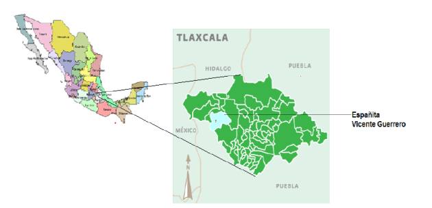The Españita municipality belongs to the state of Tlaxcala, which is located in the central Mexican highlands region. The municipal head is located at an altitude of 2 640 meters, its geographical position according to the INEGI (2010) is 19° 27'4'' north latitude and 98° 25' 23'' west longitude. It borders the following municipalities: north Sanctórum of Lazaro Cardenas, south Ixtacuixtla, east Hueyotlipan, and west Sanctorum of Lazaro Cardenas and the state of Mexico (Figure 1).
