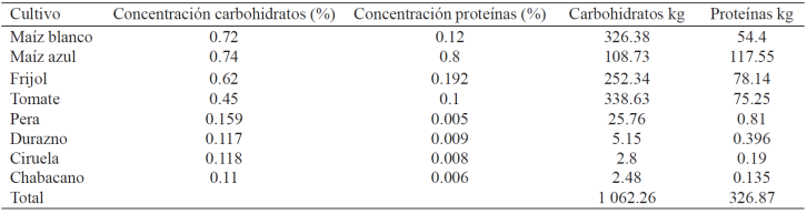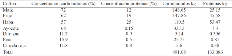 The production obtained in each crop year and the boards of the National Institute of Nutrition (INN) were used to determine the concentration culture was used to estimate the intake of carbohydrates and proteins; by rule of three input shown in Table 4, where it can be noticed that the total sum obtained by the crops produced in 2011 was 491 kg and 133 kg carbohydrate protein was obtained.