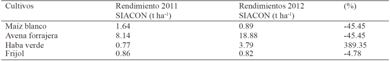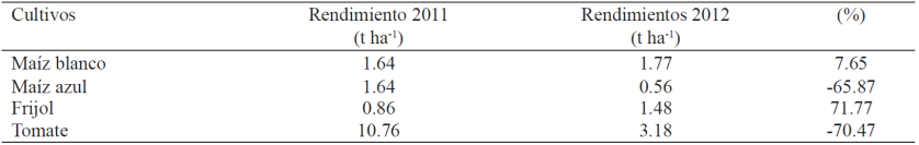 In 2012 white maize yield was 1 765.5 kg ha-1 and bean 1 477.2 kg ha-1. This was because the rainy season was more abundant and the presence of pests was minimal, however in the case of tomato itself was the presence of diseases and pests, such as fleahopper, but allowed products were applied in organic production (tricarboxilos vegetables and adherents) to control the attack, which helped to improve performance.