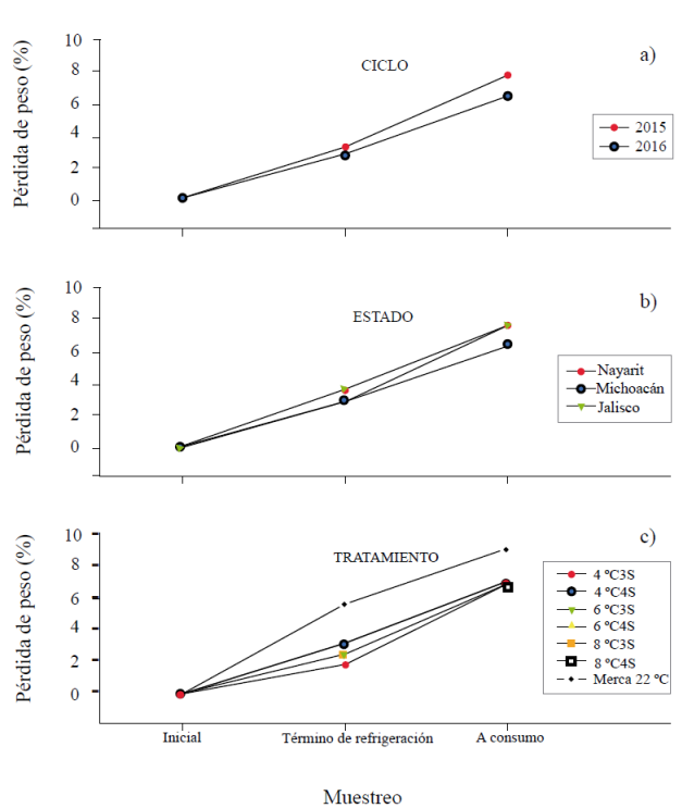 The weight loss by effect of the factors under study is illustrated in Figure 1. Regarding the cycle effect (Figure 1A), it was observed that the fruits harvested in 2015 accumulated to maturity of consumption a greater loss (7.8%) that was statistically different from those harvested in 2016 (6.5%). This can be correlated with MS content, since fruits with higher MS content (2015= 27.8%) have higher metabolic activity than fruits with lower MS (2016= 26.3%) [Erikson et al., 1971]. Regarding the effect by state or region (Figure 1B), the accumulated weight loss was higher in the fruits harvested in Nayarit and Jalisco (7.6% for both) and was statistically different from the fruits of Michoacán (6.3%), which may be correlated with the degree of roughness of the shell.