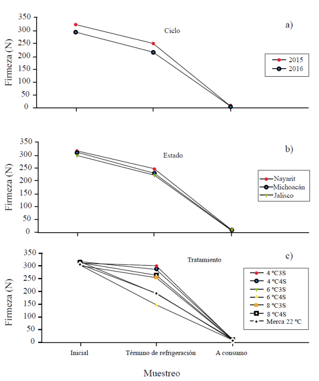 Something similar was observed in the effect by state or region (Figure 2B), where at the end of refrigeration the fruits of Nayarit showed greater firmness compared to those of Michoacán or Jalisco, which could be due to the fruits of Nayarit were processed the day of the harvest, while those of Michoacán and Jalisco were processed 24 hours after the harvest; however, there were no significant differences in consumption. The factor of greatest impact on firmness were temperature and storage time (Figure 2C). At the end of refrigeration the differences were very marked, the fruits that were kept at a lower temperature (4 °C for three or four weeks and 6 °C for three weeks) presented a high firmness, although those that remained in storage at 6 °C for four weeks decreased almost 50% of their initial firmness, however, still within the acceptable commercial range.