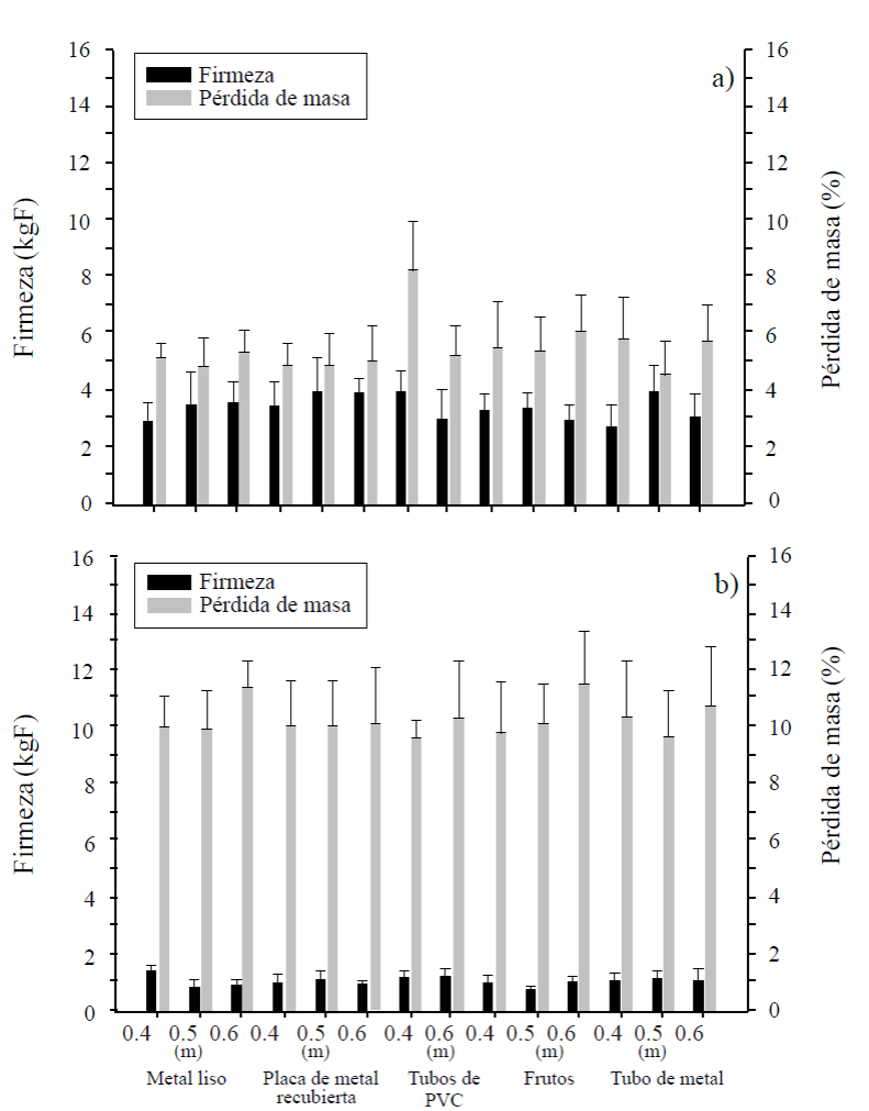 At maturity of consumption, the internal quality of the fruit was similar between treatments (p< 0.05). Metal treatments (0.5 m), coated metal plate (0.4 m), PVC pipes (0.4 m), PVC pipes (0.6 m), fruits (0.6 m) and metal tube (0.4 m) were not damaged in the internal quality. However, the remaining treatments showed darkening and small air cavities in the pulp (Table 5).