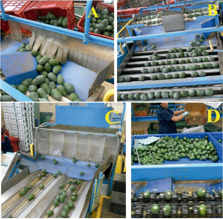 Although information have been developed on the effects of mechanical impacts and damages on post-harvest quality on apple fruit (Van-Zeebroeck et al., 2007), tomato (Desmet et al., 2004) and citrus fruits (Miller et al., 1991), among others, in avocado the information on this type of damages is scarce. The objectives of this research were 1) to quantify the magnitude and sites where the impacts occur in the line of selection and packing of avocado ‘Hass’; 2) to determine the damages that generate the impacts in the external and internal quality of the fruits; and 3) to evaluate the effect of the types of impact and the refrigeration on the quality of the fruit in maturity of consumption.