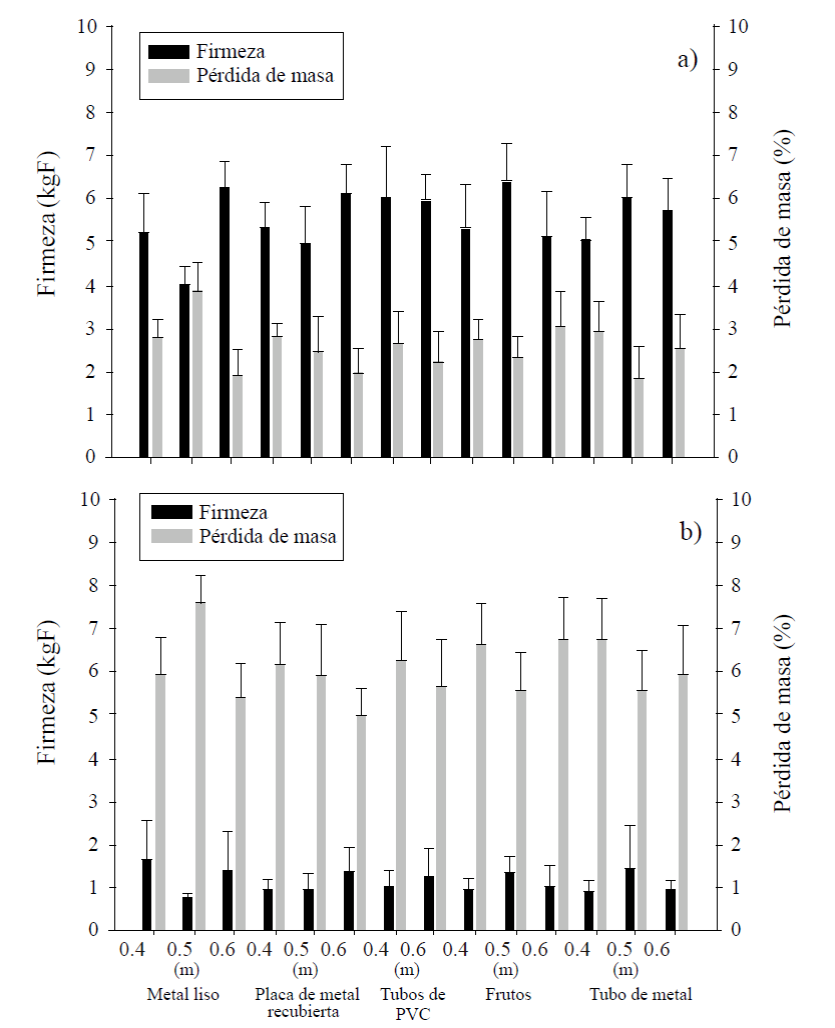For each treatment, 20 fruits were used and the impacts were induced by letting them fall freely. After the impact the fruits were stored at room temperature (23 °C ±2 °C and relative humidity 70% ±10%) until consumption maturity. At maturity of consumption the proportion of fruits with external damage (rot) was quantified. Something similar was done to evaluate the internal quality of the fruit, although in this case each fruit was opened in half. Other internal disorders, such as pulp discoloration, vascular darkening, and basal rot were not considered, as they are not caused by impacts on fruits (Bill et al., 2016).