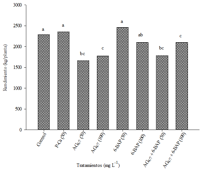 La Figura 4 muestra que el rendimiento en los tratamientos 6-BAP y P-Ca en 50 mg L-1 fue similar al testigo. Este comportamiento podría deberse al efecto concentración. Previas investigaciones (Ramírez et al., 2010) reportan que la P-Ca a 200 mg L-1 incremento el rendimiento 83% en tomate de cascara. Esta influencia que ha tenido P-Ca en aumentar el rendimiento, también se obtuvo en pera (Costa et al., 2004a) y manzano (Greene, 1996; Unrath, 1999; Basak y Rademacher, 2000). El resto de los tratamientos tuvieron una tendencia a tener un rendimiento menor que el control. Este efecto puede reflejar mayor estímulo a desarrollo vegetativo el cual compitió con la formación floral y por lo tanto menos rendimiento (Rademacher, 2004).