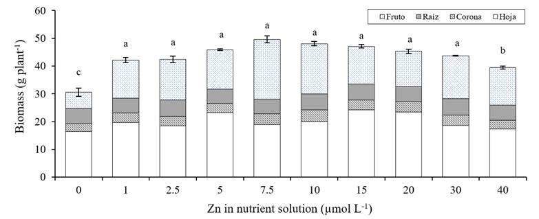 Figure 1 Effect of the dose of Zn in the nutritive solution on the biomass accumulated in strawberry cv. Albion. Means with the same letters are not statistically different (Tukey, p≤ 0.05).