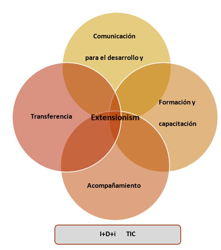 From this definition, extensionism is not only the educational action towards a sector of the population, so in addition to making technology transfer, through tools and communication resources that favor innovation, there must be technical accompaniment processes for producers and livestock farmers, and should be complemented with technological resources such as technological updating, innovation and research, in addition to the use of information and communication technologies (TIC), graphically the components of the new extension they are shown in Figure 1.