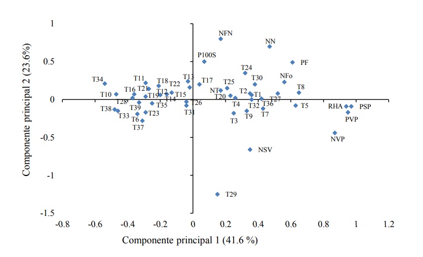 In the biplot that was constructed with the cultivars and the variables, it was observed that the main components 1 (41.6%) and 2 (23.6%) explained 65.2% of the original total variation (Figure 1).