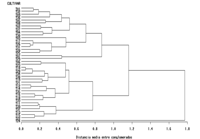 An analysis of variance was made, and its mean squares were used to calculate the components of variance and broad-spectrum heritability (H2), the latter considered as an estimator of the genetic variability between accessions (Pérez et al., 2007). A comparison of means between cultivars was also performed with the Tukey test (α= 0.01). The arithmetic means of each cultivar for the 11 quantitative variables were used to obtain a data matrix: the cultivars were assigned to the rows and the values of each variable to the columns. With this matrix we obtained the analysis of the main components (ACP, Sánchez, 1995) and conglomerates (method of the unweighted arithmetic mean, UPGMA Method). Both analyzes were performed with the statistical analysis system Statistical Analysis System (SAS, 1988), but the biplot graph was made with Microsoft Excel 2010, using the scores of the first two main components (Pérez et al., 2009).