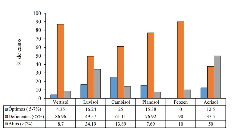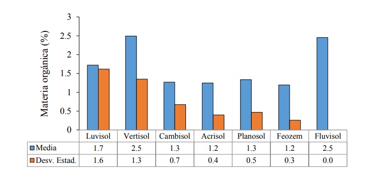 Figure 1 shows that in any soil type the OM content was higher than 2.5% and with the exception of Vertisol and Fluvisol, in all soil types the average content was below 2%. In 59.3 of the sites the OM content was ≤1.5% considered a critical limit even for non-volcanic soils.