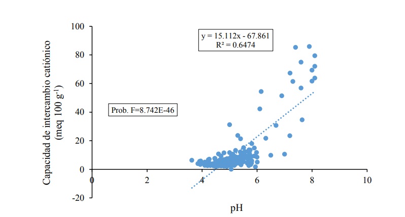 Figure 2 shows that 65% of the behavior of the CIC is explained by the acidity level of the soil; as the pH increases, new negative charges are generated in the exchange complex and is reported by Anzorena (1995); Benzing (2001), as variable CIC, which is more common in the CIC coming from the OM, than from the clays. Foth and Ellis (1996) point out that, in mineral soils with low organic matter content, the influence of pH on the CIC is minimal.