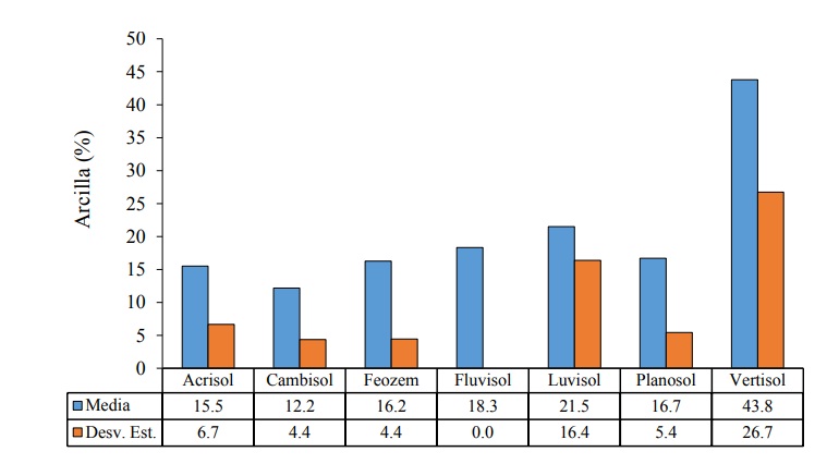 Figure 4 shows that Vertisols contain the highest values of clay with an average of 43.8% (± 26.7%), therefore 60% of the cases that have the highest values of CIC (>40 meq 100 g-1) belong to this type of soil where only 14% of the corn area is located. According to Roy and Barde (1962), Vertisols have a high CIC due to the predominance of type 2:1 clay, for example, a soil with 50-60% clay has a CIC of 50-66 meq per 100 g of soil. According to these authors, the montmorillonite clay content gives an approximate estimate of CIC because 1 g of clay imparts on 0.5 to 0.7 meq of CIC to the soil and the contribution of organic matter to the CIC is quite low in the tropical zone (Roy and Barde, 1962).