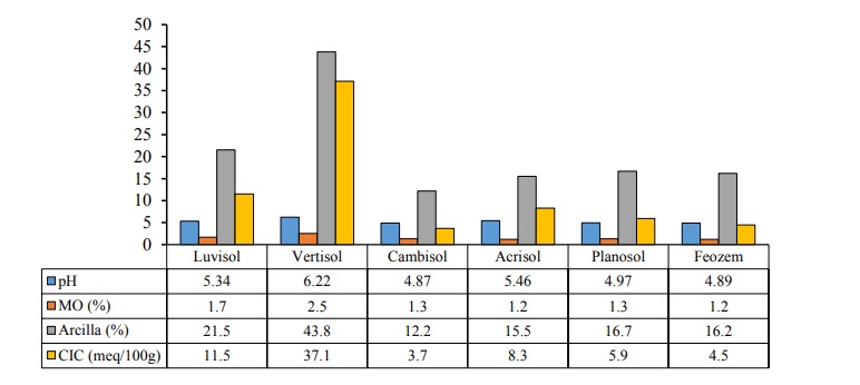 Figure 6 clearly shows that the plots located in soils of the Vertisol class have the best fertility conditions, since they have higher values of pH, OM, clay and CIC; however, in this type of soil only 14% of the maize area is sown. Due to its capacity to store nutrients (CIC) and clay content, it is followed by Luvisol type soils, in which an estimated 34.5% of the area cultivated with corn is located.