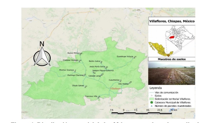 The study is considered representative because it included the localities and types of soils where the largest maize surface is cultivated in flat lands of the municipality of Villaflores. Due to the availability of resources, only samples composed of soils at a depth of 0 to 20 cm were taken, which were determined in the laboratory pH, P, K, Ca, Mg, Na, Fe, Cu, Zn, Mn, B , sand, silt, clay, Al, H and organic matter. Some determinations were not made in all the samples, a situation that was considered in the statistical analyzes performed. The interpretation of the properties of the soils was carried out in accordance with the provisions of the Official Mexican Standard NOM-021-SEMARNAT-2000 (DOF, 2002; IPNI, 1990).