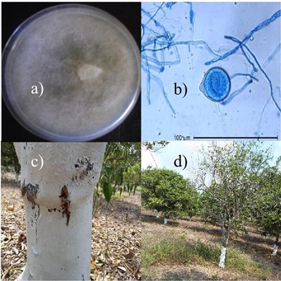 Figure 1 a) growth of Phytophthora spp.; b) mycelium and sporangium of Phytophthora.; c) rubber on the trunk; and d) tree with symptoms of gummosis.