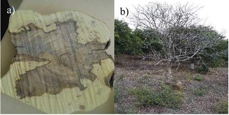 Figure 3 Damage from Lasiodiplodia theobromae. a) stem rot; and b) descending death, the tree presents total defoliation.