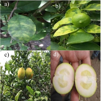 Figure 4 Symptomatology of HLB. a and b) irregular spotted on the leaves; c) color inversion; and d) deformed fruit with thickening of the pericarp.