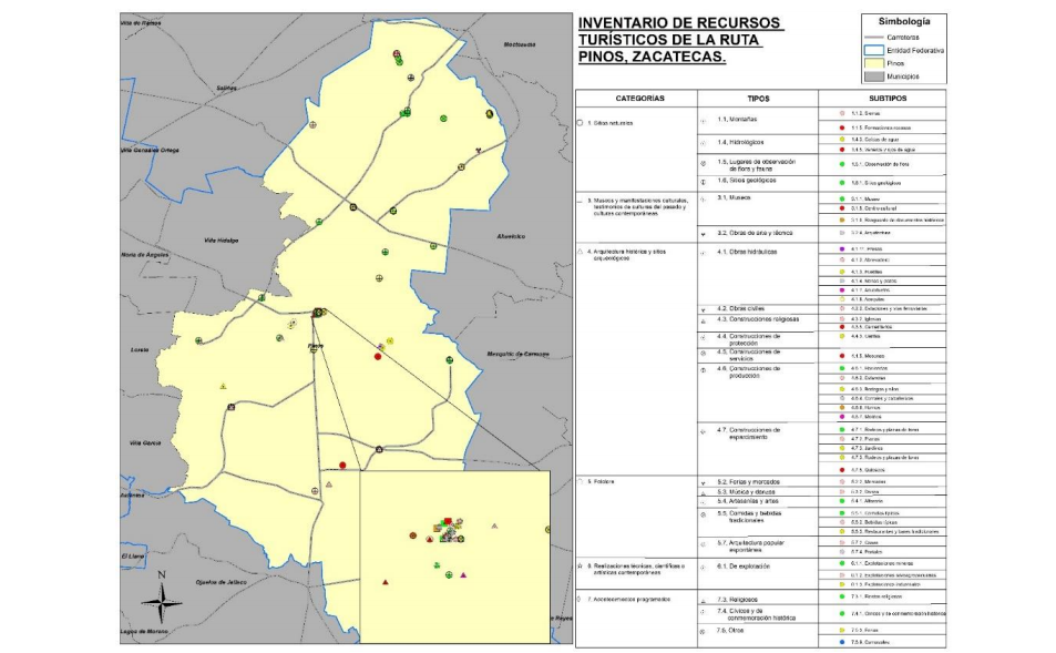 In the case of the Pueblos Mágicos, the inventories of tourist resources are elaborated to comply with the requirements of incorporation into the federal program, within the guidelines the goods of the entire municipality are requested, although in reality, it is limited to those goods that are they find within the locality that is postulated (DOF, 2014). Pinos has a study and inventory of the municipality's tourism heritage (SECTURZ, 2016) that lacks intangible cultural heritage and natural heritage records. Currently, the state of Zacatecas is working on an initiative to unify the registers of property assets throughout the state. Inventories of cultural and natural heritage are used for the development of tourism products that articulate the social actors of the municipality and generate innovative tourism experiences (Bautista, 2015).