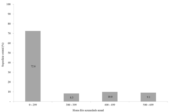 The conditions identified between 300-500 HF per year, which represent 18.3% of the state area, may be suitable for the Biloxi variety, which coincides with Salgado et al. (2018). The HF demanded by some varieties of cranberry of low and medium cold requirement according to García (2011) were found in the present work, so in Nayarit it is highly feasible to grow it.