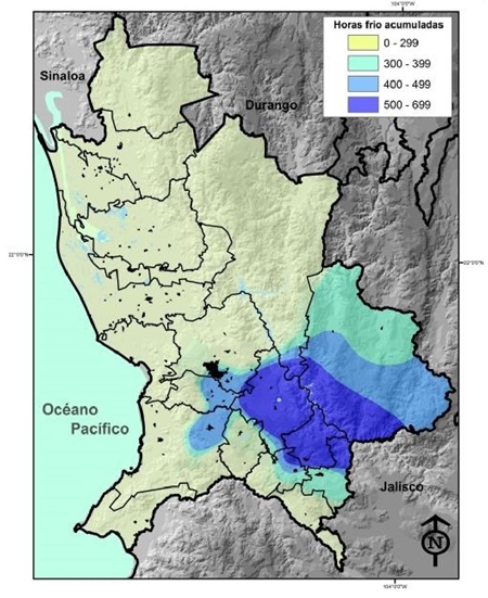 The climate is a determining factor of the yield and quality in agricultural production systems. The objective of this work was to quantify the cumulative cold hours in Nayarit and to use this information as an agroclimatic indicator in the regionalization to produce cranberry (Vaccinium corymbosum L.). The research used data from the network of agrometeorological stations in Nayarit, which consists of 38 automated stations that collected fifteen-minute data of 11 variables. With minimum temperature records, cold hours were calculated, which were organized by month and accumulation per year. Using a geographic information system, the distribution of annual cold hours (HFA) was cartographically represented, with interpolation and organization of the results in four phases (<299, 300-399, 400-499 and 500-699). For each HFA class, the area was quantified in each of the 20 municipalities. Finally, the precision of the interpolation model against a database outside the main data set was evaluated. The results show that only in 27.4% of the state surface accumulate more than 300 HFA which is the minimum requirement for cranberry. The thermal conditions for cranberry are mainly located in the center and south of the state, highlighting the municipalities of Compostela, Xalisco, Tepic, Santa María del Oro, Jala, La Yesca and Ixtlan del Río that represent 81.6% of the apt surface. The results are a precedent for the accumulation of cold hours in Nayarit and serve as a planning tool for decision makers, technicians and producers interested in the cultivation of cranberry.