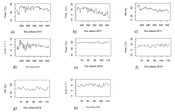 Two series of daily meteorological data of (T, RH, Rs) and calculated (ETo P-M) were determined: one from September 2 to December 12, 2017 and another from March 4 to April 23, 2018. With the data of the first one, the parameters (Table 1) of the models were modified and with those of the second the models were evaluated with the parameters defined in this work. The data used for parameter estimation and evaluation are presented in Figure 3.