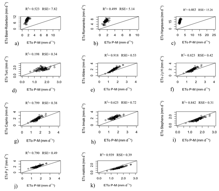 The root values of the mean square of the error (RSE) of the ETo models with their modified parameters based on Baier-Robertson, Romanenko and Hargreaves temperature were: 0.21, 0.23, 0.20 mm d-1 and the R2 of 0.501, 0.599 and 0.626 respectively (Table 2).