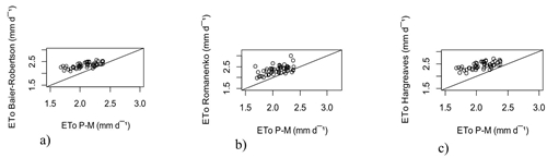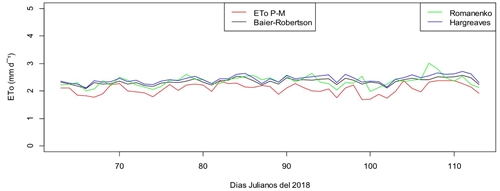 The statistics of the evaluation of the models with 51-day data, the Baier-Robertson and Hargreaves models obtained coefficients of determination (R2) of 0.461 and 0.411 and their RSE of 0.31 and 0.39 mm d-1 respectively. The statistics of the Romanenko method are (R2) of 0.3 and RSE of 0.34 mm d-1 was the best method based on temperature.